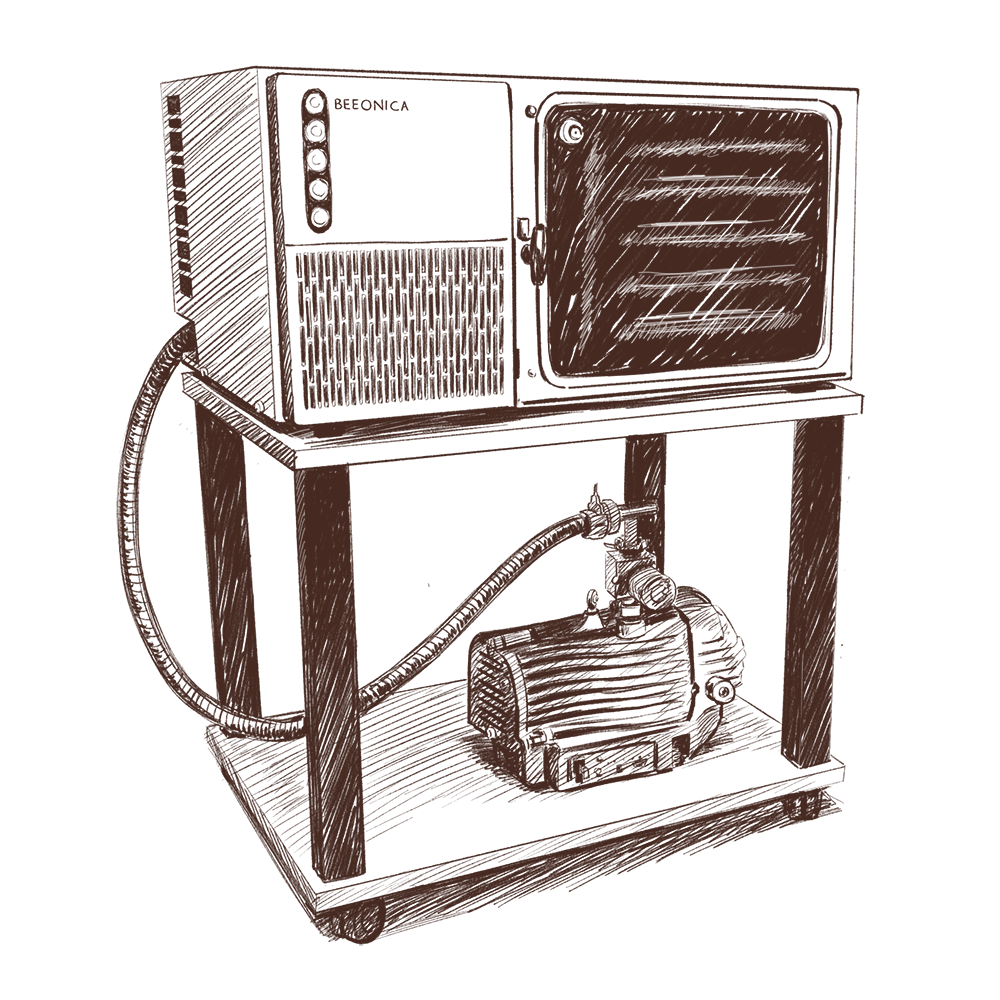 Il veleno viene raccolto cristallizzato entro un'ora dall'ossigenazione [FIG. 2], subito liofilizzato [FIG. 3] ed introdotto fresco nell’arco di quarantotto ore nella soluzione viso e collo BEEONICA® per preservarne le qualità [FIG. 4].